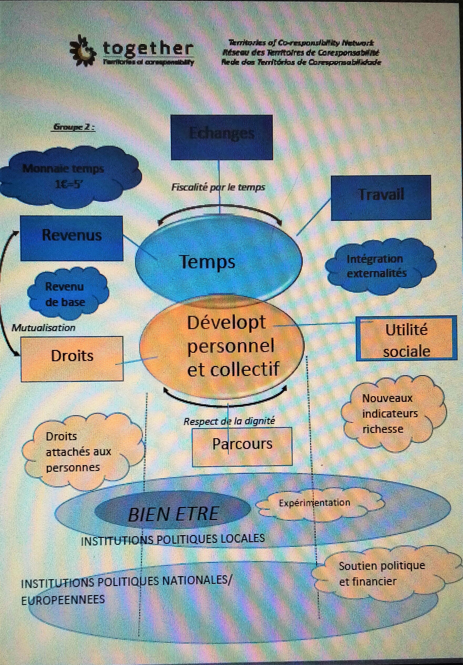 D’après les nombreux débats et discussions que nous avons eues lors de ces 2 jours, il en ressort une matrice sur laquelle nous devons agir pour améliorer le bien-être global : Le temps. Il faut aussi réorganiser les échanges entre les gens et mettre en place des indicateurs d’utilité sociale. Pour changer les politiques publiques, il est important de comprendre le système, montrer des exemples de succès au niveau local afin de faire remonter ça au niveau supérieur. Il faut aussi construire une toile de relation à différents niveaux afin de pouvoir toucher le plus de monde possible et être connecté.